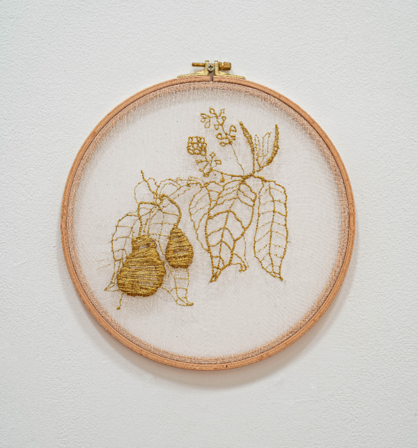 bordado com fio dourado sobre gaze, montado em bastidor